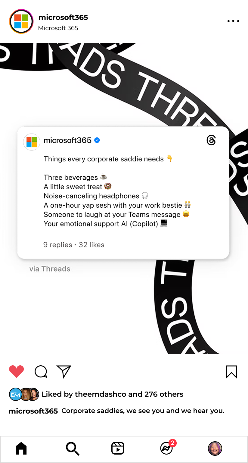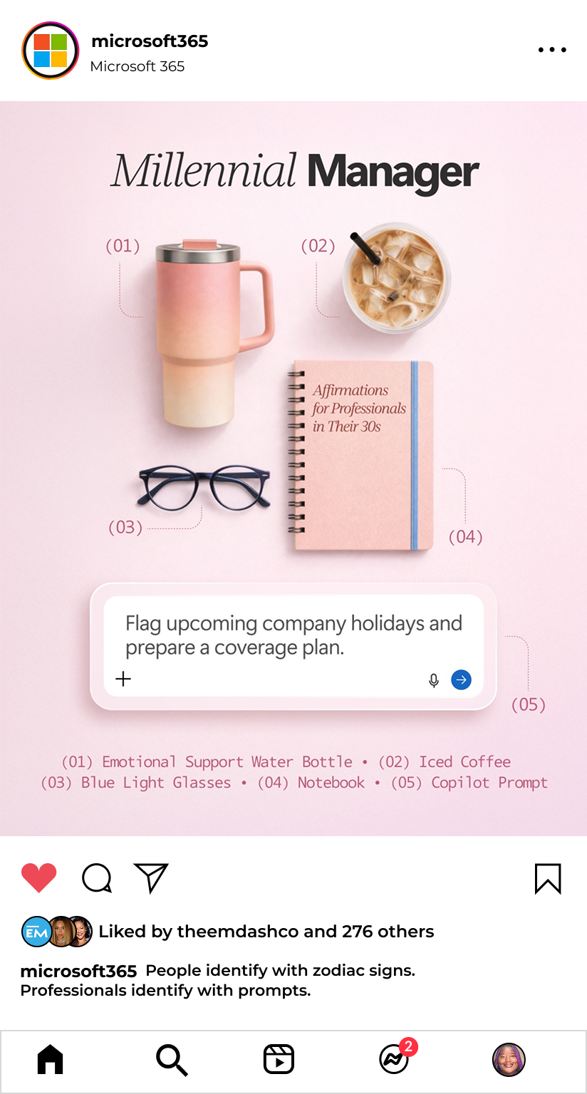 I worked on the Microsoft account at Assembly, developing creative concepts and writing copy for social content across Microsoft’s brand and product channels. From Copilot to PowerPoint, Teams to Excel, this work required me to get deep into the world of Microsoft and their products and explore how they empower professionals across industries to do their jobs more effectively and efficiently. What I discovered? A love for Microsoft that goes beyond the work and taps into a culture that sees technology not just as tools, but as a possibility for collaboration, creativity, and connection.